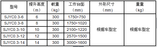 產品規格(gé):車(chē)載式液壓升降平台根據(jù)升降高度可分(fèn)為:6、8、10、12、14米升(shēng)降平台,設備(bèi)載重(chóng)300公斤至500公斤。客戶可根據需求選用解放、東風、輕騎、福田、電瓶車等任何車型,設備直接采用汽車或電瓶的直接動力升降。